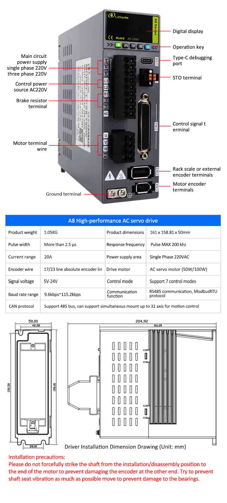 Pulse/RS485 50W/100W 2500/3000RPM A8 Vysoce přesná sada ovladačů AC servomotoru STO ABZ