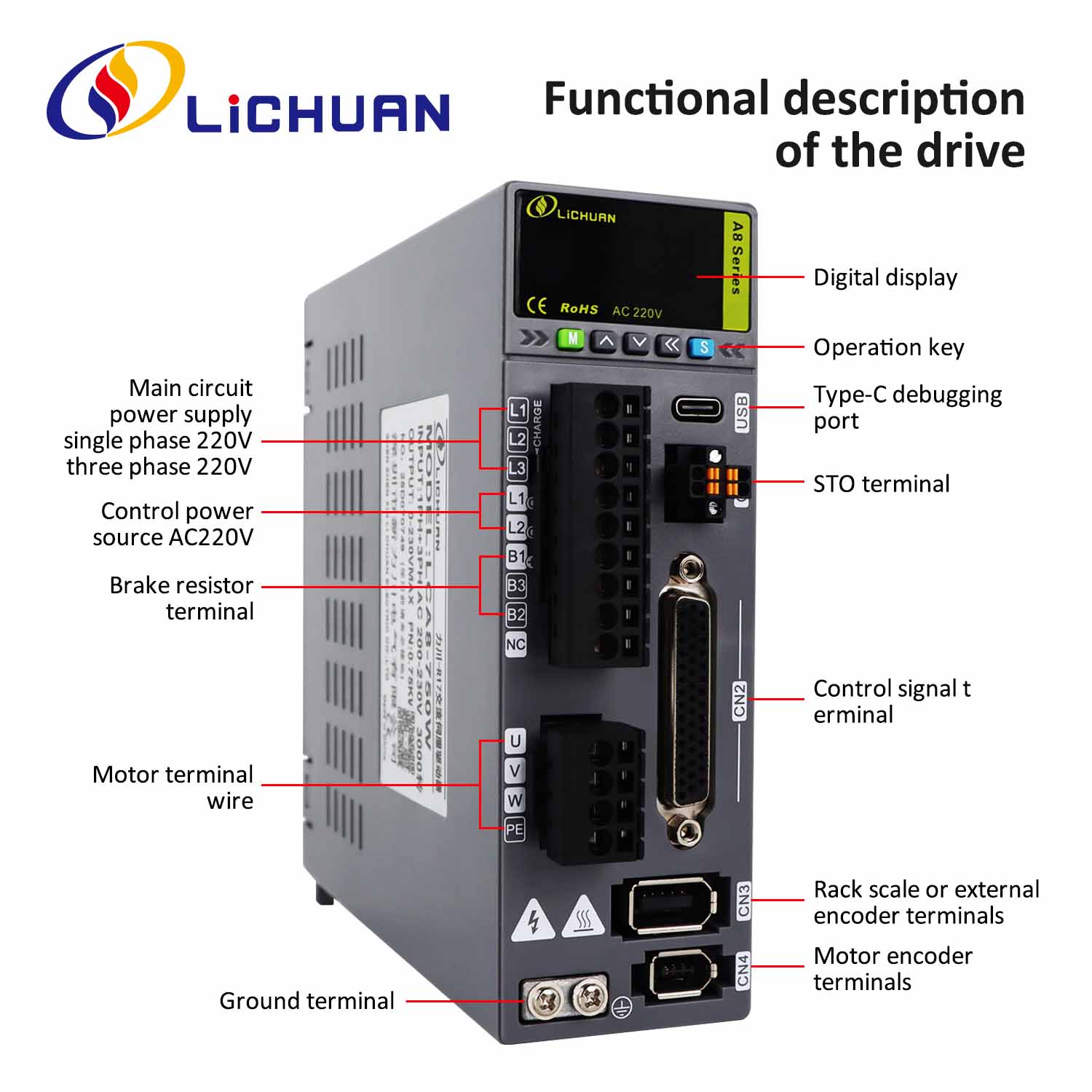 Sada ovladačů servomotoru Lichuan A8 Vysoce přesné STO ABZ 1000W 1KW 3,2N.m 220V 5,8A 2500/3000RPM IP65