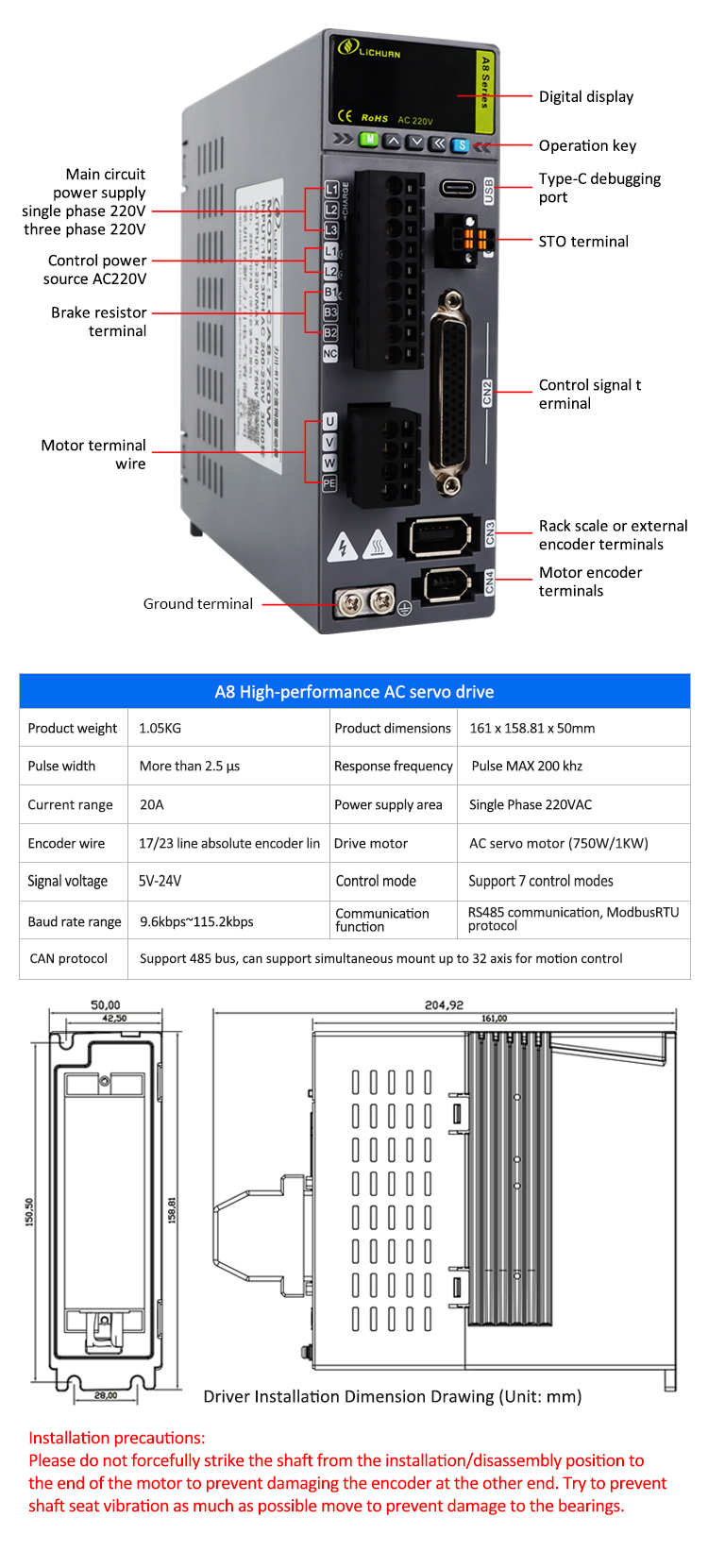 Pulse/RS485 750W/1000W/1001W 2500/3000RPM A8 Vysoce přesná sada ovladačů AC servomotoru STO ABZ